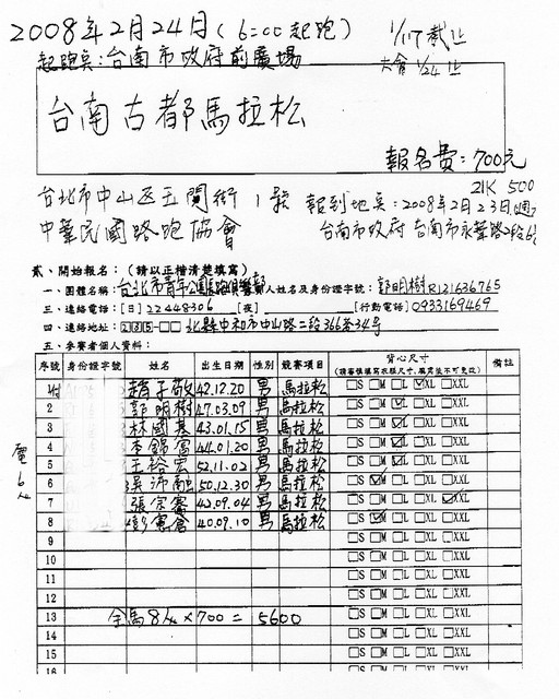 200800224台南古都馬拉松參賽名單